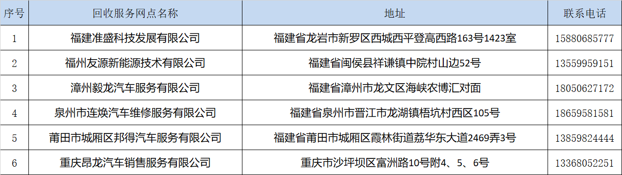 3、新龙马汽车在车辆销售区域建立了废旧电池回收服务网点(如下),规范回收服务网点相关管理制度,保障电池回收的安全可靠,并签约符合行业规范条件且有资质的综合利用企业进行处理。